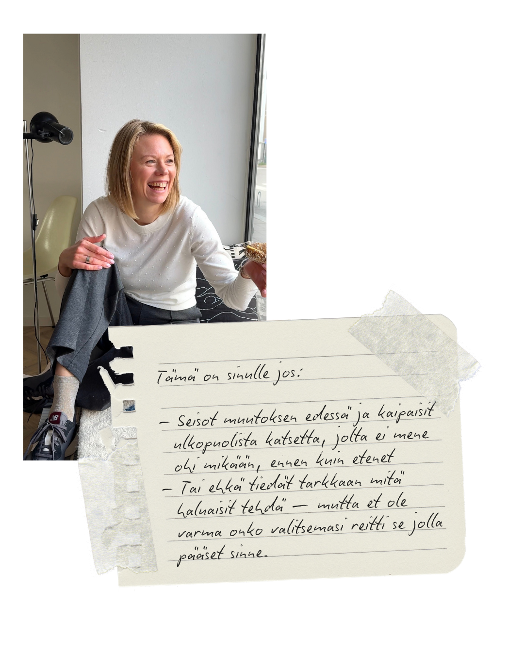 Ennen työpajaa tutustun tilanteeseesi kysymysten kautta, ja sessiomme jälkeen saat muistiinpanot + selkeät next stepit kirjallisena.